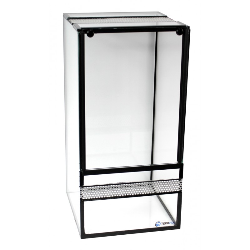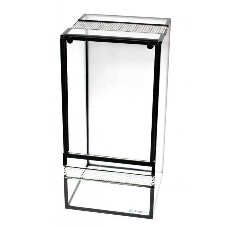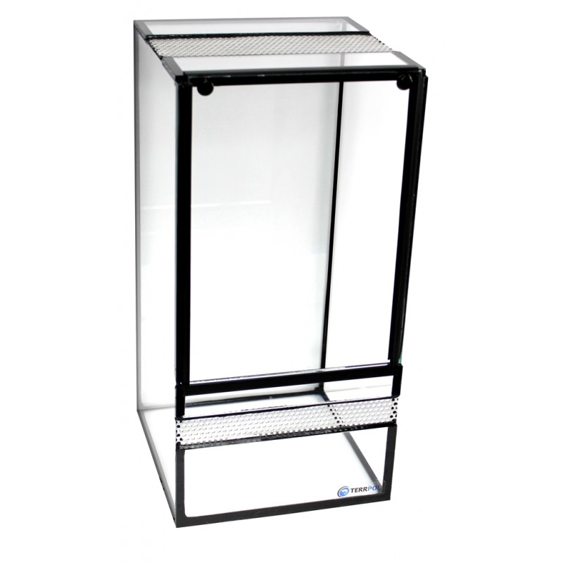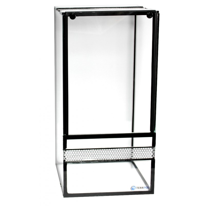 Terrarium 30x25x60cm (dł/szer/wys), wykonane z wysokiej jakości szkła typu float, grubości szkła 4mm. Otwierane z przodu typu gilotyna. Na krawędziach montowane kątowniki PCV. Wentylacja góra - dół, wykonana z blachy perforowanej o średnicy oczek 3mm.