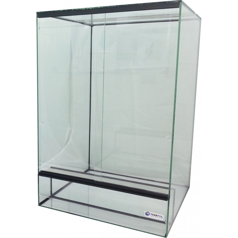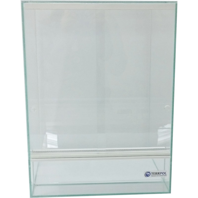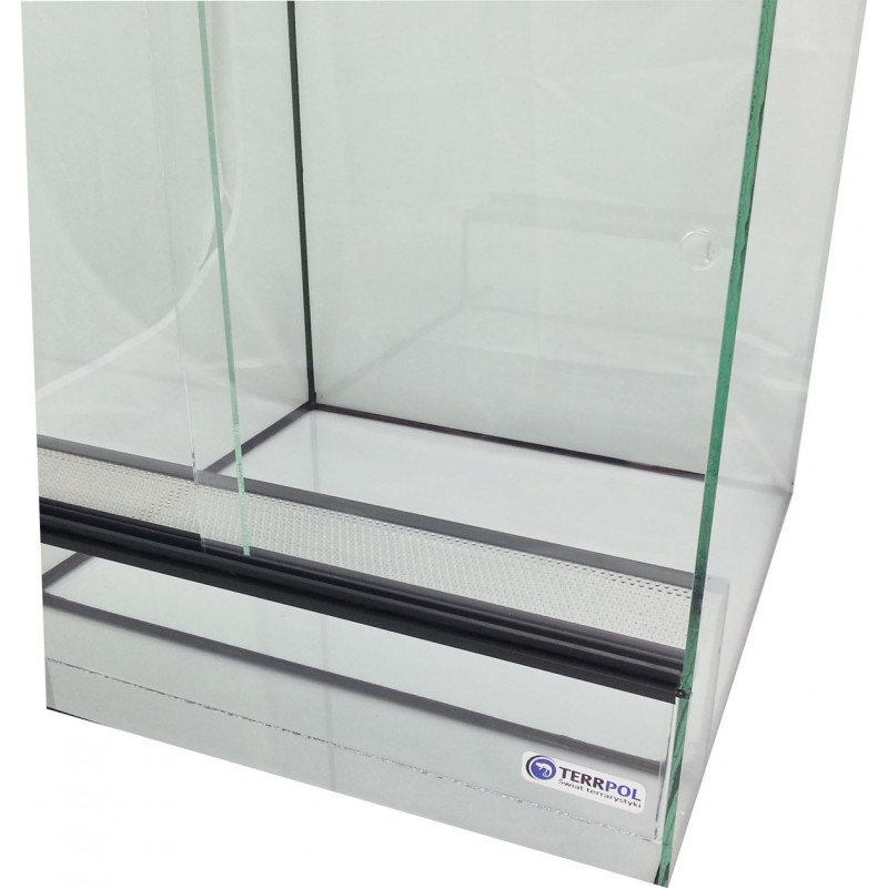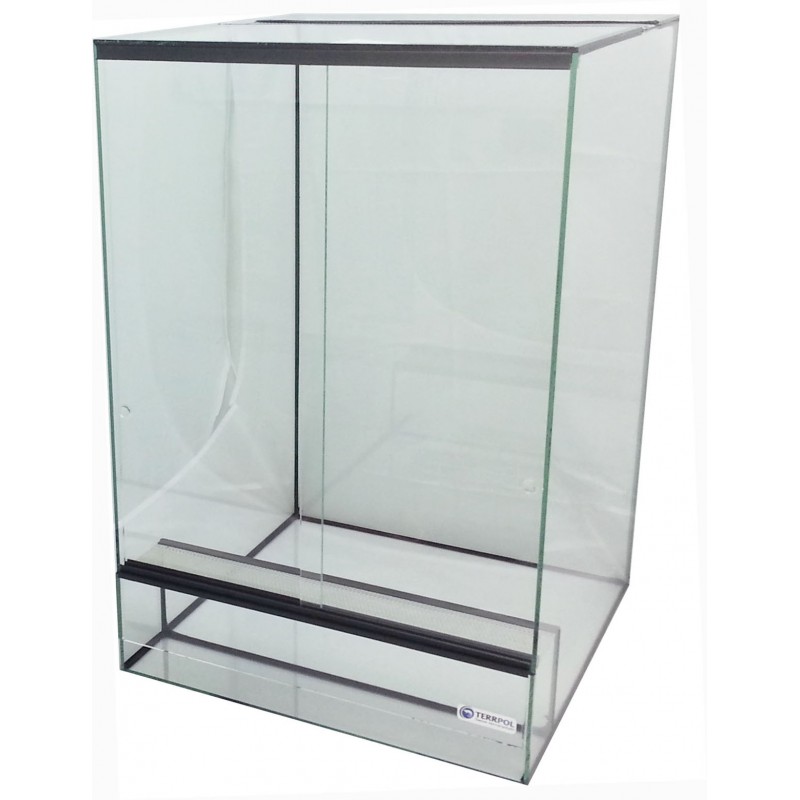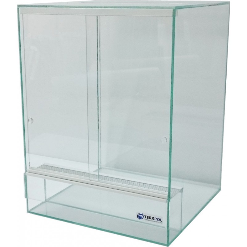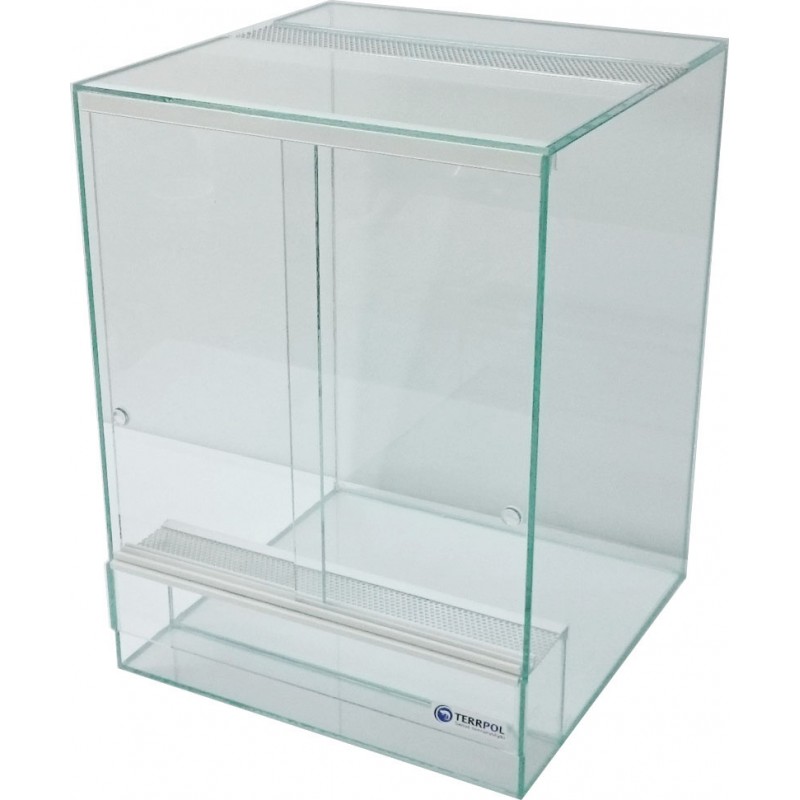Terrarium 25x30x40cm (dł/szer/wys), wykonane z wysokiej jakości szkła typu float, grubości szkła 4mm. Otwierane z przodu poprzez rozsuwane szklane drzwiczki znajdujące się na prowadnicach wykonanych z PCV. Na krawędziach montowane kątowniki PCV. Wentylacja góra – dół, wykonana z blachy perforowanej o średnicy oczek 3mm.